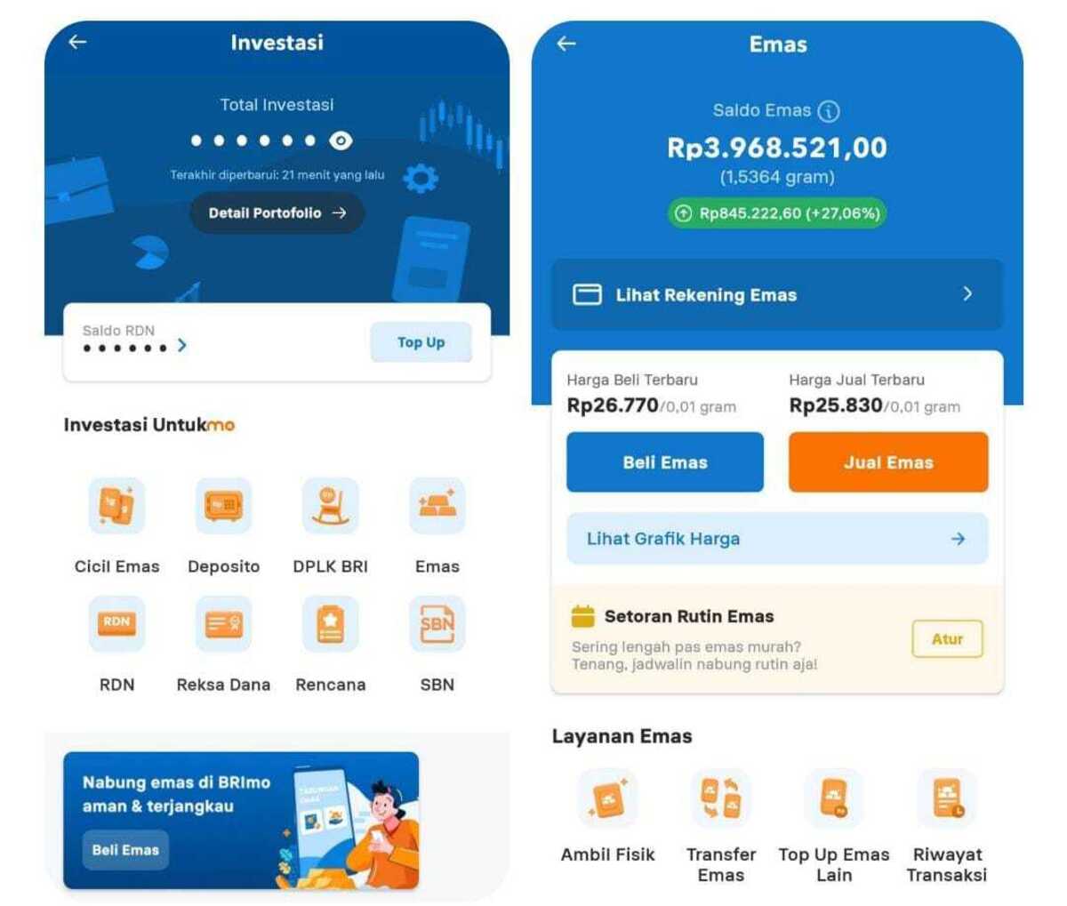 “Tabungan Emas di BRImo memungkinkan nasabah untuk mulai berinvestasi emas dengan nominal yang sangat terjangkau, mulai dari Rp10.000. Emas merupakan instrumen investasi yang terbukti stabil dan aman, dan kini masyarakat bisa mengaksesnya hanya lewat genggaman tangan,” ujar Bernadi Kurniawan.